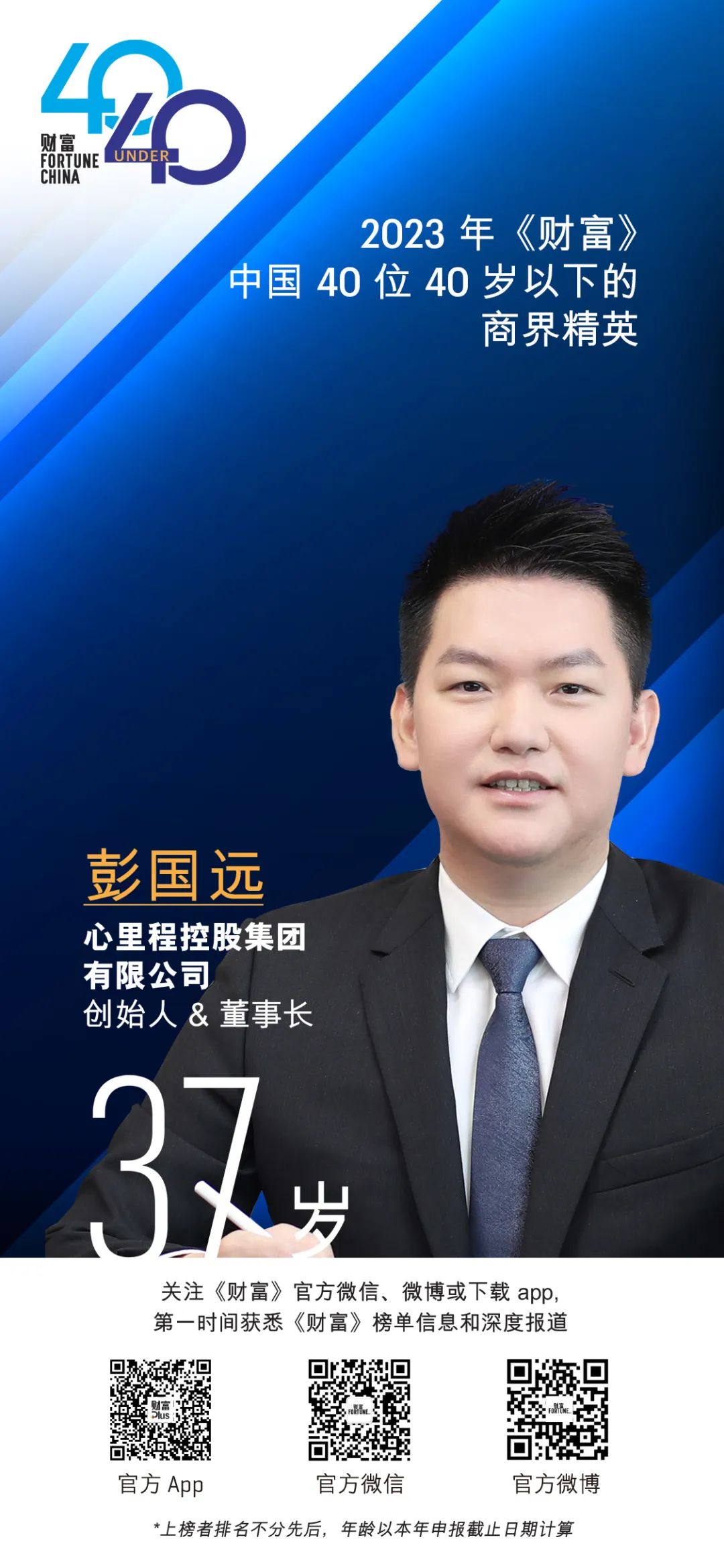 7月18日,全球最具影响力的商业杂志之一《财富》(FORTUNE)发布了2023年“40位40岁以下的商界精英”(《FORTUNE》40 under 40 Business Leader)榜单,心里程控股集团创始人•董事长彭国远荣登该榜单。