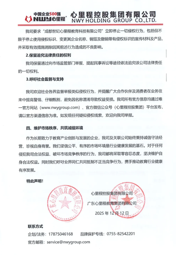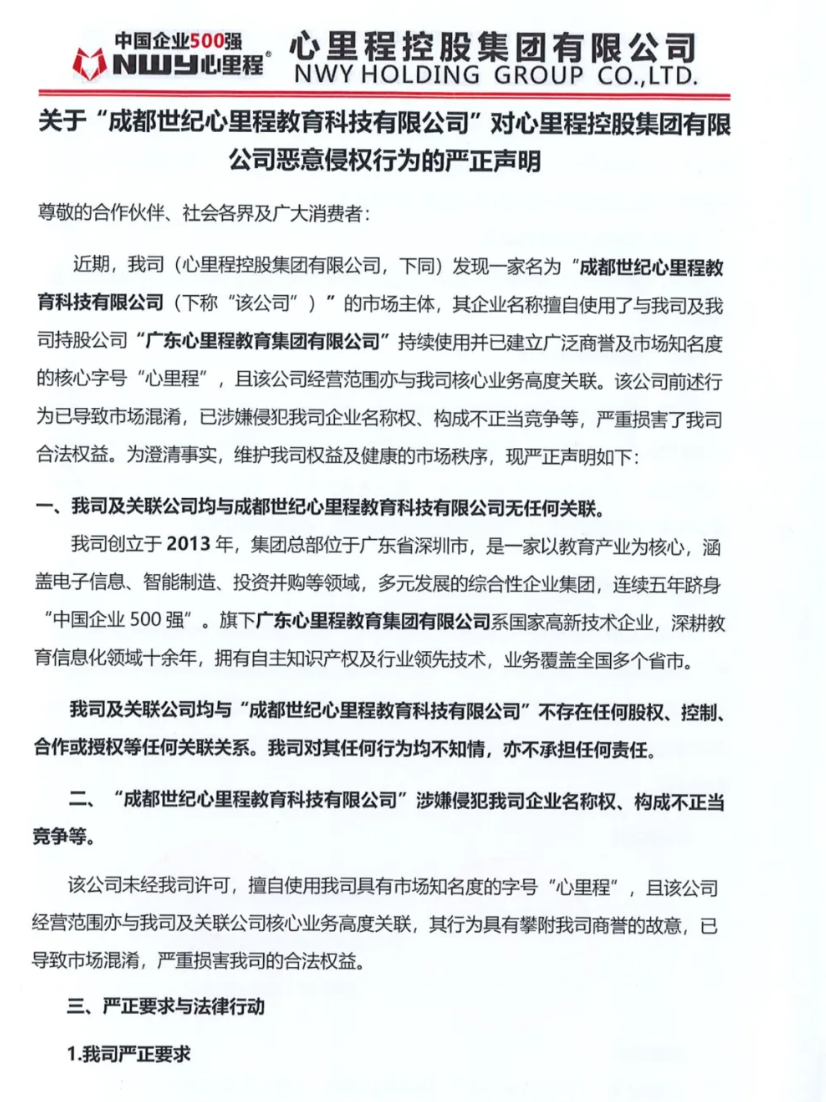 近期,我司(心里程控股集团有限公司,下同)发现一家名为“成都世纪心里程教育科技有限公司(下称“该公司”)”的市场主体,其企业名称擅自使用了与我司及我司持股公司“广东心里程教育集团有限公司”持续使用并已建立广泛商誉及市场知名度的核心字号“心里程”,且该公司经营范围亦与我司核心业务高度关联。该公司前述行为已导致市场混淆,已涉嫌侵犯我司企业名称权、构成不正当竞争等,严重损害了我司合法权益。为澄清事实,维护我司权益及健康的市场秩序,现严正声明如下: